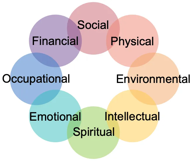 Emotional, physical, occupational, social, spiritual, intellectual, environmental, and financial.